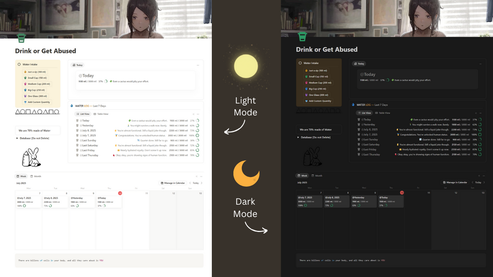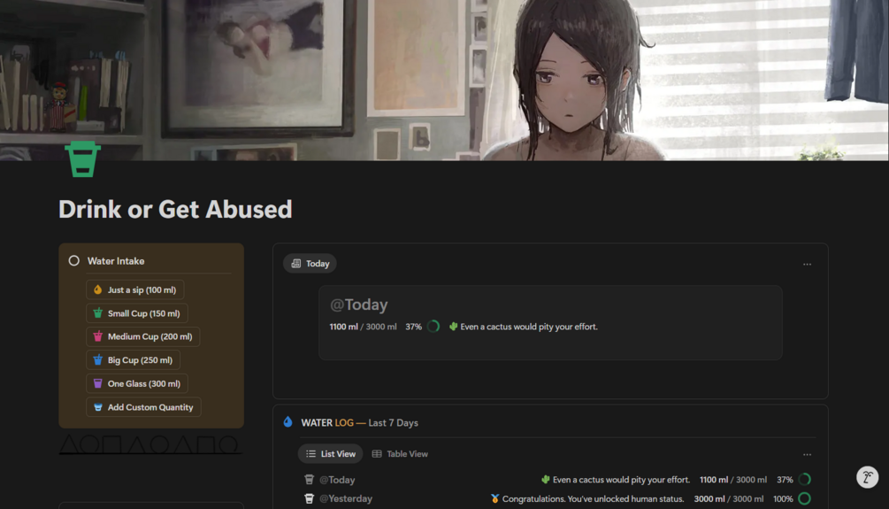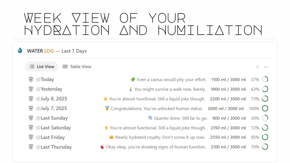 "Drink or Get Abused" is a brutally honest Notion template that bullies you into staying hydrated—with sarcasm, sass, and just enough guilt to actually work.